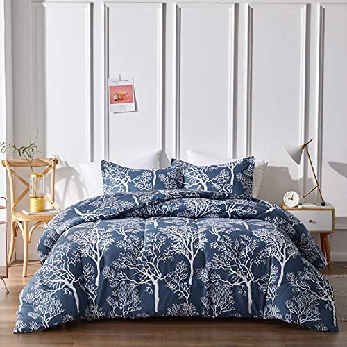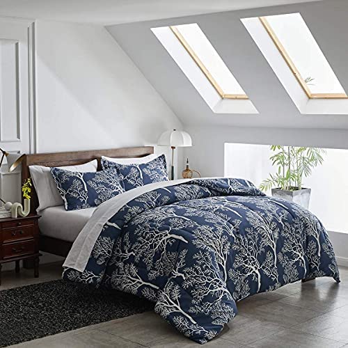 Comforter Set Queen 88×88 Size Navy Trees Branch Print Reversible Down Alternative 800 TC Adult Teen Summer Duvet Sets 1 Winter Microfiber Comforter with 2 Pillow Shams