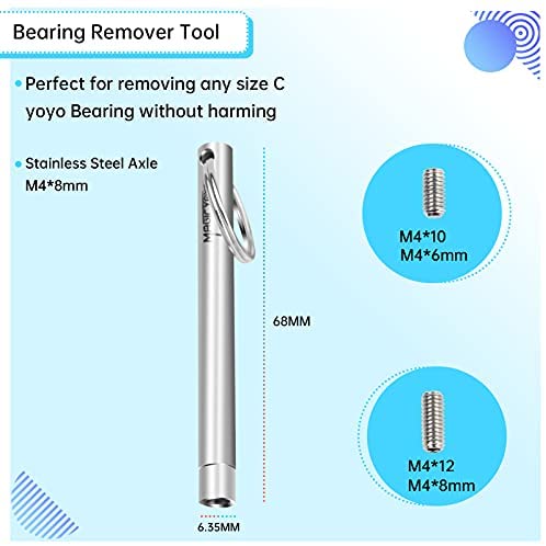 b>This Complete Magic Yoyo Accessories Bearing Pack will meet all your needs Coming with Unresponsive & responsive yoyo bearing ,yoyo removal tool, yoyo strings. Easy to replace your yoyo bearing, Enjoy more amazing yoyo tricks.Bearing Removal Tool – Easy to remove the pesky Bearings!MAGICYOYO bearing removal tool is perfect for removing any size without harming or damaging your yoyos. Just insert the tool in the center of the bearing, turn with your hands and pop the bearing off the yo-yo with ease! Its really that simple!YOYO Bearings – These are replacement bearings for most unresponsive & responsive yo-yos carried by MAGICYOYO Size C Fits most yoyo like MAGICYOYO, YoYoJam, YoYoFactory, SPYY, CLYW and many other manufacturersBearings for long spin and unresponsive & responsiveplay. SPECIFICATION1. Bearing Removal Tool- Body Material: Stainless- Length: 68mm- Outer Diameter:6.35mm2. Unresponsive10 Ball Golden Bearings & 8 Ball U Type Bearing – Size C : 6.35mm*12.7mm*4.762mm3. Narrow C Responsive Bearings – Size C : 6.35mm*12.7mm*3.175mm4. Yoyo String- Material : 100% Polyester- Size: 113cm/44.4 inches longPACKAGE INCLUDED2 x 10 Ball Golden Bearing2 x 8 Ball U Type Bearing1 x Bearing Removal Tool6 x Strings( colors in random) 3 x M4*10 stainless Steel Yoyo Axles 3 x M4*8 stainless Steel Yoyo Axles