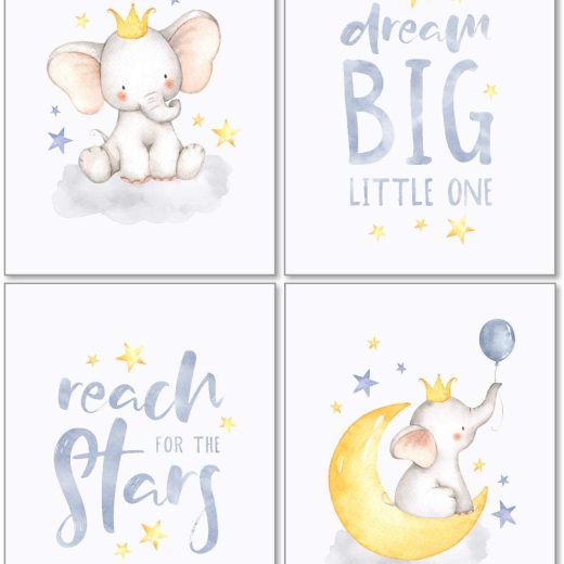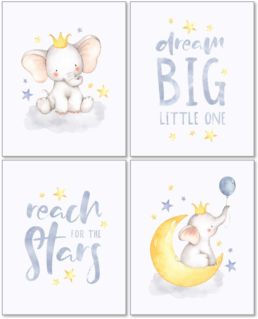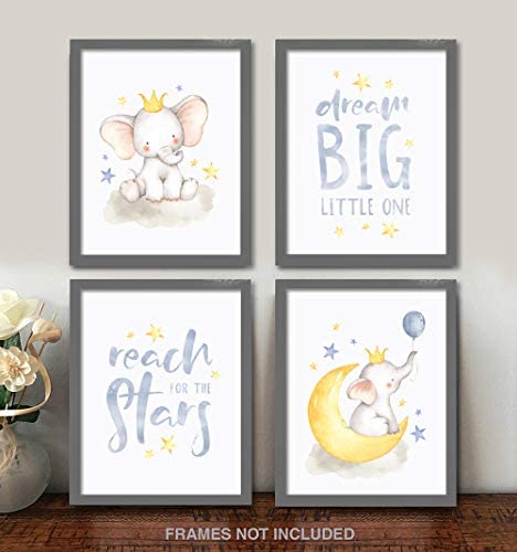 8×10 Unframed Set of 4 Artwork Prints Unframed Flexibility, ready to be placed in your favorite frames for display Dream Big Watercolor Illustrations printed on thick, White Pearl Art Paper Display in any space large, small, grouped with the others or hung separately Elephant Babies Nursery Phrases Decoration, Gender Neutral Bedroom Design