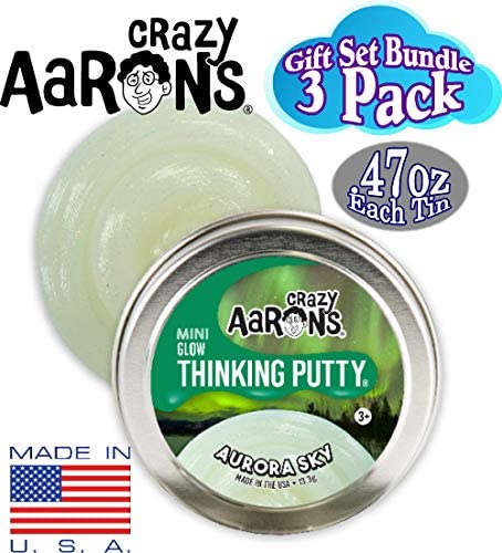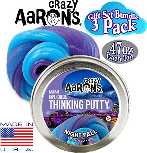 Crazy Aarons Putty SUPER SKY Mini Tins (.47oz each) Nightfall (Hypercolor), Super Star (Illusion) & Aurora Sky (Glow) Gift Set Bundle – 3 Pack, is AWESOME! Made in the USA of non-toxic silicone, never dries out & is easily removed from solid surfaces. Gluten free, latex free and amazing for special needs, party favors & much more! For Ages 3 and up – Fun for the whole family!
