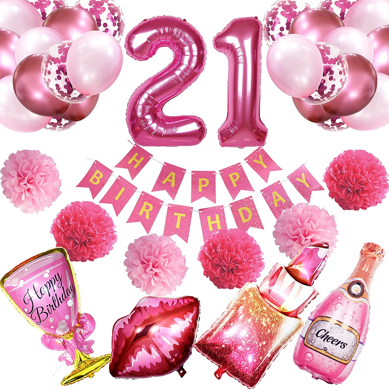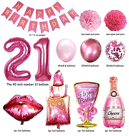 Crenics 21st Birthday Decorations for Her – Hot Pink Happy Birthday Banner, Pom Poms, 21 Number Balloon, Lipstick Champagne Balloons and 24 Latex Balloons for 21st Girls Women Birthday Party Supplies