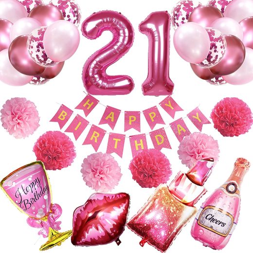 Package Includes- You will get a set of hot pink happy birthday banner, 1 hot pink number 21 balloon, 4 foil balloons, 6 paper pom poms, 24 latex b…