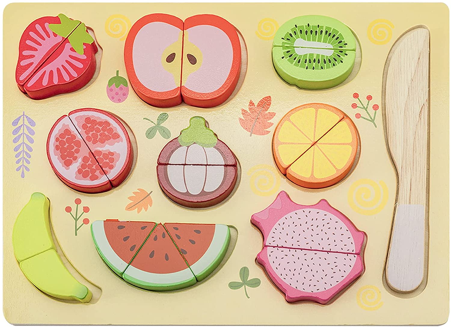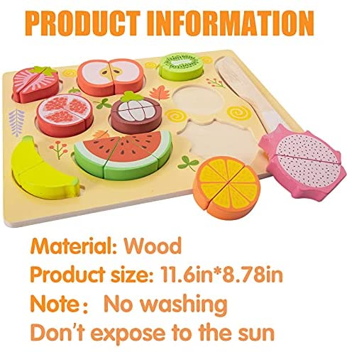 Wooden Cutting Puzzles: Size: 11.6in x 8.78in, Contain: banana, strawberry, apple, kiwi, pomegranate, mangosteen, orange, watermelon, pitaya, knife. Great Design for Toddler: Contains 9 kinds of objects and a wooden paring knife. Mom can teach the baby to recognize various items. The baby can use the wooden paring knife to cut them in half one by one, and put them into the puzzle. Great Educational Toy: These wooden toddler puzzles have clear and realistic patterns, which can stimulate childrens vision and curiosity, and are suitable for kids ages 1-5 to improve their eye and hand coordination when playing! Not only provides children with fun play time, but also helps them practice problem solving and spatial reasoning in the process of completing puzzles. Keep your kids away from video games. Great Gift for Children: Wooden cutting puzzles is very suitable as a gift for 1-5 years old baby on birthday, Christmas, Easter, New Year and other holidays. After-Sale Service: We are confident that our toddler puzzles will satisfy you. But if you receive a product with any quality problems, or you have any questions about our products, please contact our after-sales customer service before choosing a return, we will provide you with more after-sales service options.
