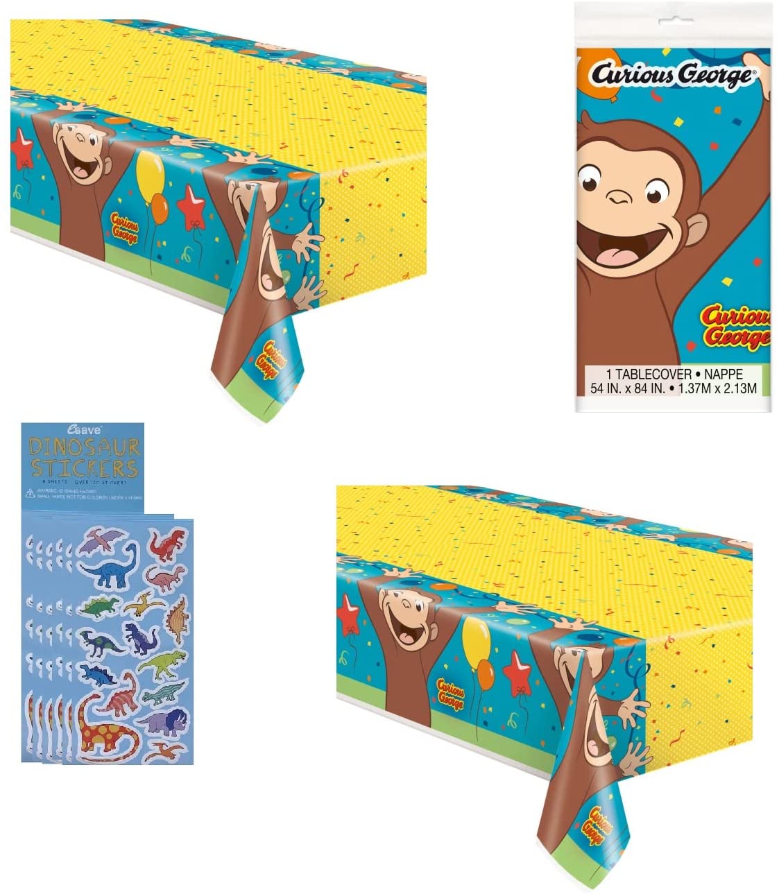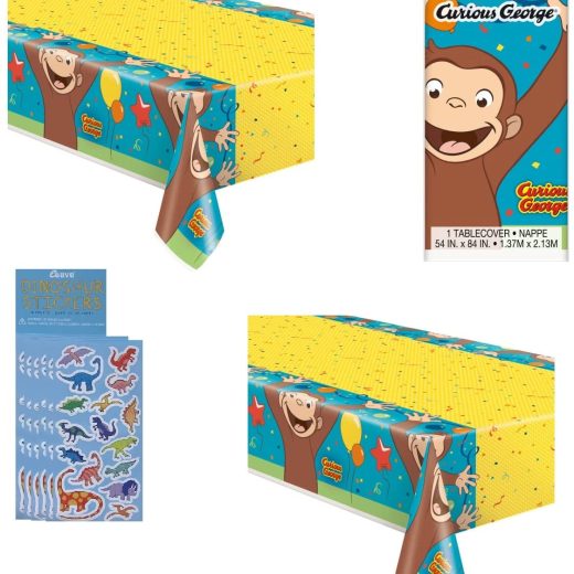 Curious George Party Supplies Bundle Pack Includes 2 Plastic Table Covers and 8 Dinosaur Sticker Sheets.