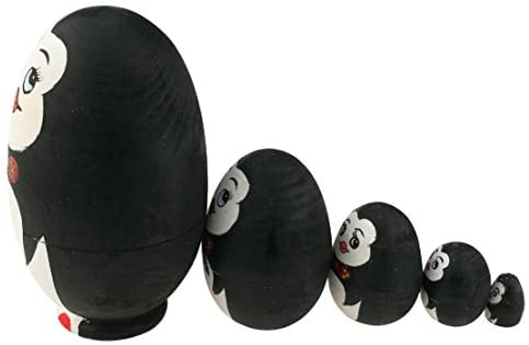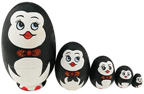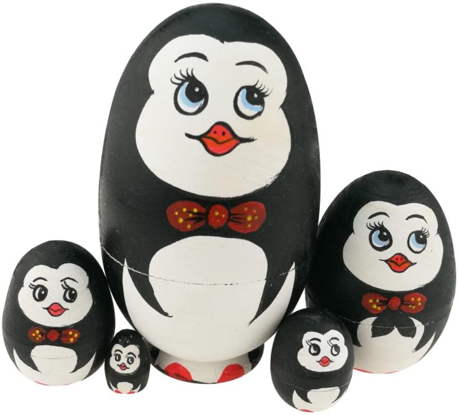 Adorable penguin pattern nesting dolls.It has a little bowtie on neck,so cute All the making process is handmade.We also have other animals for you to choose Contains 5 dolls with decreasing size placed one inside the other to appear as one This set is egg shape,specially fit for Easter.Kids will spend great time with it Russian nesting dolls is full of special meanings,its a perfect gift to give anyone and special decoration