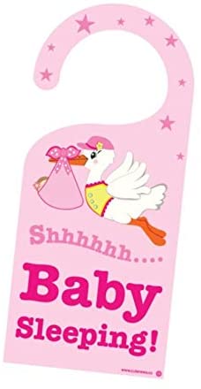 Cute News Baby Girl Sleeping Stork Door Hanger – Do Not Disturb or Knock – Newborn Sign – Great Gift for Parents – Pink