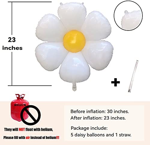 [About package]: –You will get 5 Pcs daisy balloons and 1 straw. [About size]:–Flat size 30 inches. Shipped uninflated. The picture shows the size after inflation: about 23 inches. [Simple to inflate]:–The foil balloon could SELF SEAL after inflate,without extra operating.Easy and simple. There are two HOLES on the TOP to string,Perfect addition to birthday celebration. [These dont float!]:–30 inch balloons do NOT float when inflated with helium.You can string the balloon with a line and hang it where you need it. [Caution]:–Over-inflation,sharp objects, unclean surfaces, direct SUNLIGHT, and excessive squeezing can easily damage and burst the balloons .