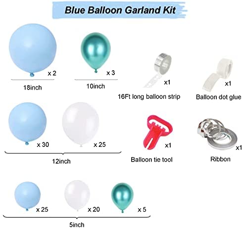 Light Blue Balloon Garland Arch kit include: 2pcs18in Macaron Blue Balloons; 12in (30pcs Macaron Blue Balloons+ 25pcs White Balloons) ;3pcs 10in Me…