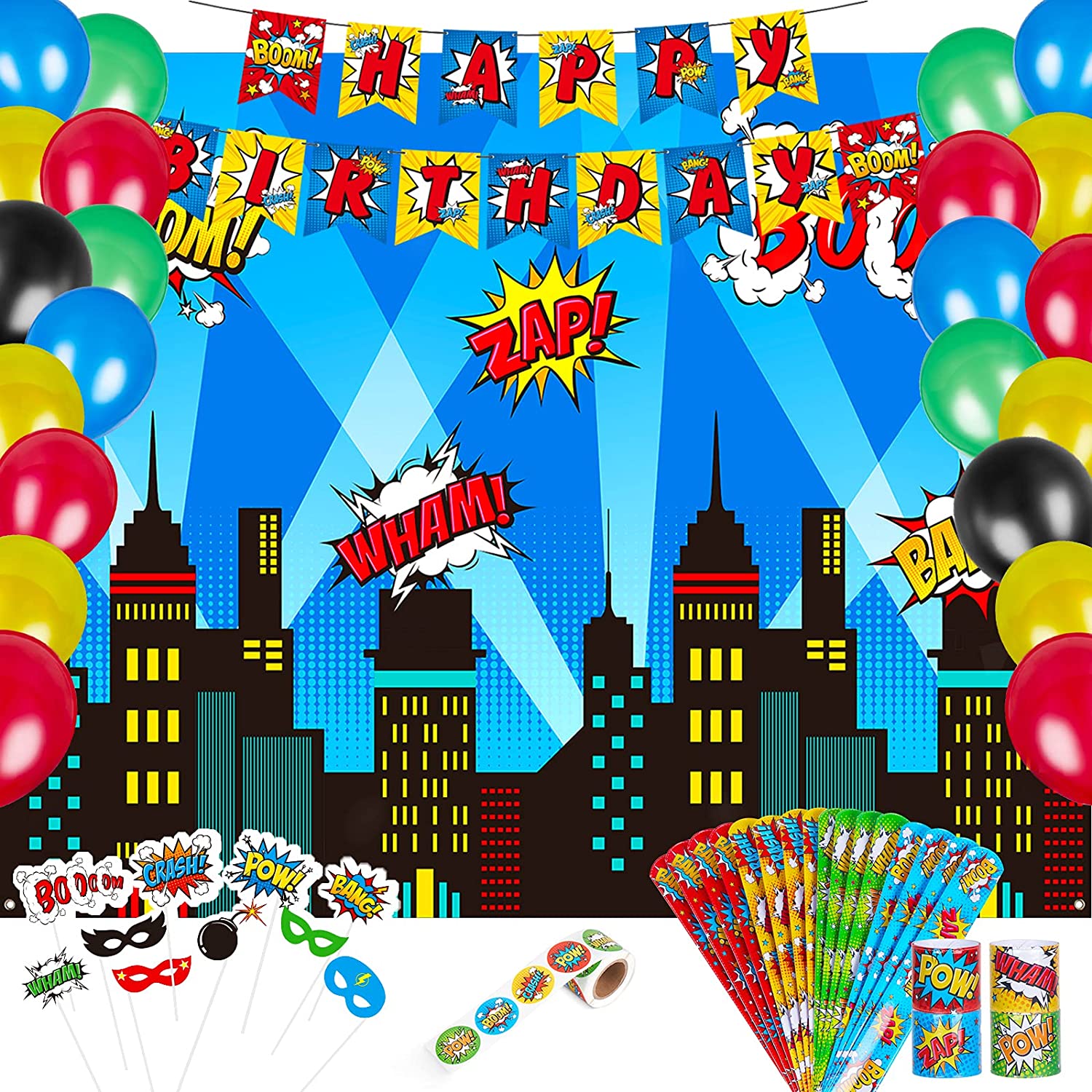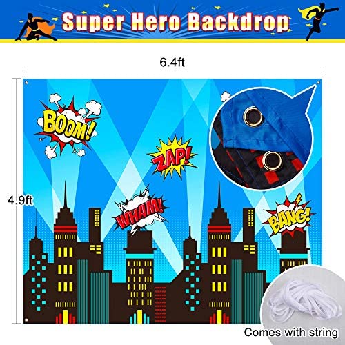 SUPERB BIRTHDAY PARTY SUPPLIES: Nice assortment of decorations and party favors will be literally a SMASH hit. Kids are over the moon to have a superhero party or trunk or treat! TERRIFIC FOR PHOTOGRAPHS: Everyone will have a blast posing like superhero in front of the backdrop and using all props. So fun and such an easy party upgrade! PERFECT SUPERHERO BACKDROP: Made of oxford fabric, the backdrop can not only lead to fantastic shots at party, but also reuse in bedroom decorating a wall. AWESOME PARTY FAVORS: kiddos enjoy playing with slap bracelets and stickers immensely. These can be used as wonderful take home gifts, prizes for kids, piñata fillers. EASY TO SETUP: Coming with string, superhero backdrop has rings on the edges for easy hanging. No need to glue the props on the sticks as well.