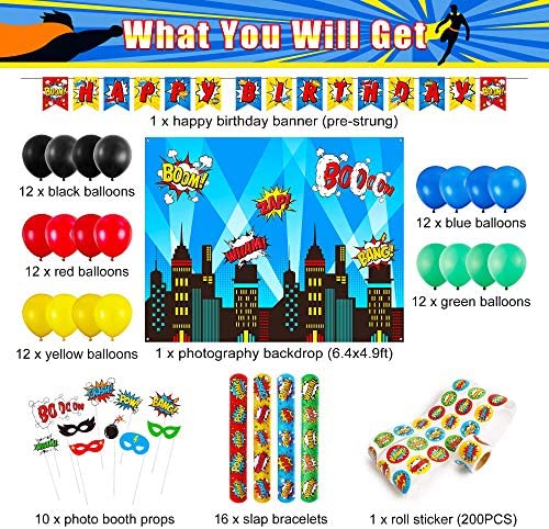 Decorlife Superhero Party Favors, 16 Pack Slap Bracelets, 6.4 x 4.9ft Backdrop, 200PCS Stickers, Photo Booth Props, Pre-strung Banner Included, for Superhero Birthday Party Supplies