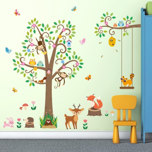 DECOWALL SG-2106 Scroll Tree with Animals Wall Stickers Wall Decals Peel and Stick Removable Wall Stickers for Kids Nursery Bedroom Living Room