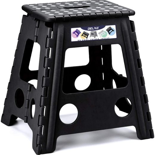 ?Safe Upgrade Stand Stool?Features improved the folding bar,which can prevent from collapse inward while standing on it.Delxo have designed a safety stop gap feature that allows the foldable stool to prevent being squashed, great for adults. Four round corner super safe protect your body from clashing. All of this design is put your safe first. ?Premium Quality ?The internal structural design 16 inch Folding Stool in Black is unique makes the step stool extra strong and safe. It can hold up to 250 lbs Max !!! Which is mainly used for adults indoor sitting. Please make sure the step stool is fully opened before use. ?Space Saving Foldable Stool ?Delxo step stool save your closet space more than 90% when it folded up.Its quickly and easily folds away for convenient storage so you can opens with one flip of the hand.Also you can hides them in corner at home because its so compact. ?Widely Use & Portable?Great folding stool for in the kitchen, bathroom, dining room, office, garden, camping, fishing and more.Carry this quick-fold step stool wherever you go. ?Quality Gurantee?Keep using quality materials to ensure the best quality.Our folding step stool has been approved by EN 14183 Certificate,Sweet satisfaction with 1 Year comprehensive warranty.?Note?For safetys sake,when we need to stand on it and reach up a high place.Please standing on the stool must keep both feet on the middle of the stool and dont shake wildly.