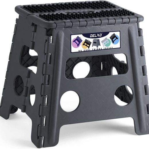 Upgrade Dotted TextureUnique Embossing design increases the stability of the folding stool and provides Comfortable to sit on and Non-Slip.Features improved the folding bar,which can prevent from collapse inward while standing on it. Safe Upgrade Step StoolDelxo have designed a safety stop gap feature that allows the foldable stool to prevent being squashed, great for kids and adults. Four round corner super safe protect your body from clashing. All of this design is put your safe first. Space Saving Foldable Stool Delxo step stool save your closet space more than 90% when it folded up.Its quickly and easily folds away for convenient storage so you can opens with one flip of the hand.Also you can hides them in corner at home because its so compact. Widely UsePortable folding step stool for kitchen, bathroom, rvs and more. The internal structural design is unique makes the step stool extra strong and safe. It can hold up to 300 lbs Max !!! Please make sure the step stool is fully opened before use. Quality GuranteeKeep using premium quality materials to ensure the best quality.Our folding step stool has been approved by EN 14183 Certificate.For safetys sake,when we need to stand on it and reach up a high place.Please standing on the stool must keep both feet on the middle of the stool and dont shake wildly.