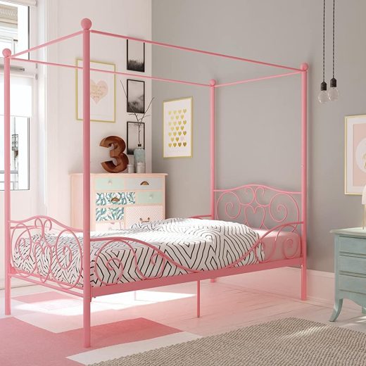 DHP Metal Canopy Bed with Sturdy Bed Frame – Twin Size (Pink)