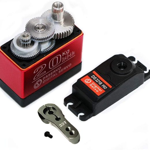 Specification: Update DS3218 PRO is new launched product in 2019.It continue keeping high quality as previous models,such as: CNC aluminium middle Shell for better heat dissipation, two ball bearings on the output shaft for reduced friction.Light weight,high-speed big torque, water-resistant,sensitive,responsive,low noise and so on. What makes it special is that the full Stainless Steel Gear which offer faster speed and accuracy and longer service life.It will help you to control your model better. Electrical Specification: Operating voltage range: 4.8 – 6.8V Operating speed ( 5.0V ): 0.12 sec/60 degree Operating speed ( 6.8V ): 0.09 sec/60 degree Stall torque ( 5.0V ): 21kg/cm Stall torque ( 6.8V ): 23.5kg/cm Control Specification: Control System: PWM(Pulse width modification) Pulse width range: 500~2500 µsec Neutral position: 1500µsec Running degree: 180° (when 500~2500 µsec) Dead band width: 3 µsec Operating frequency: 50-330Hz Rotating direction: Counterclockwise (when 500~2500 µsec) Mechanical Specification: Bearing: Double bearing Gear Type: Stainle Steel Connector wire: 17.7inches(450mm) Motor: 3-pole(s) Waterproof performance: IP66 Package: 1 x DS3218 PRO Digital Servo 1 x 25T Adjustable metal arm Other options: Pack of 2 20KG servos, please search ASIN: B07TKTQ2NZ 35KG Coreless servo 270°,please search ASIN: B07SWST8D6 25KG Coreless servo 270°,please search ASIN: B07SSNJ6Y5 25KG Control Angle 270°,please search ASIN: B07GK1G5FV 20kg Control Angle 270°(PRO Version), ASIN: B07KTSVSSJ 60kg Control Angle 180°,Please search ASIN: B07KTS4L94