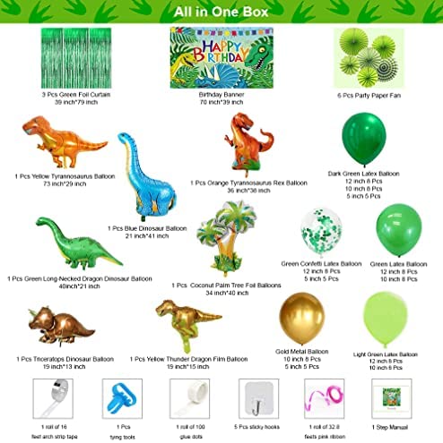 DINOSAUR PARTY IN A BOX- dinosaur party supplies with everything you need for kids party in one box, totally saves you time and money to buy them separately. We have planned out the green jungle theme party for all the dino lover kids! QUICK & EASY TO SET UP- This dinosaur decorations for birthday party also comes with a tool kit, including ballons knoting tool, ballons chanin, glue points, ribbon, wall hooks. It helps you to set up the dinosaur party quickly and makes everything about a party so much easier. PHOTOGRAPHY BACKDROP- 70 x 39in dinosaur backdrop and glittering green foil curtain are great for taking photos and give the room a special party glow. And they can be reused in bedroom for decor. BIG DINOSAUR BALLOONS- 6 different kinds of large dinosaur balloons( the most popular T Rex, Sauropod & Triceratops Balloons included) and 1 palm tree balloon light up your jurassic park birthday party! UNIQUE MEMORY – Give your boys and girls the most unique childhood memory filled with love! A special dinosaur birthday party will bring your kids and their friends a big smile! This dinosaur party pack can help make lasting memories for you, your kids, family and friends. Lets get start a dinosaur party!