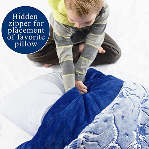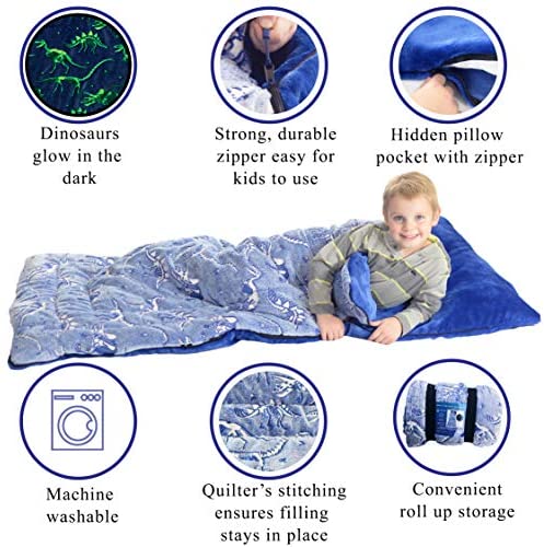 Dinosaur Sleeping Bag Glow in The Dark Dino Slumber Bag for Boys – Plush Glowing T-Rex Nap Mat for Kids- Luminescent Blue Large 66in x 30in Warm Durable Sleeping Blanket Pad for Girls – Dinosaur Gift
