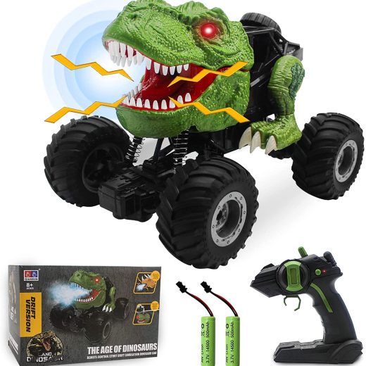 Lighting Spraying Mist Dinosaur Car: RC dinosaur trcuk can spray water mist and makes dinosaur-like roar from mouth in movement. The 4WD-drive car is equipped with 2 high performance battery to allow 50 minutes continuous playing time.
