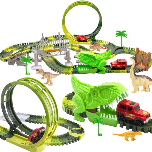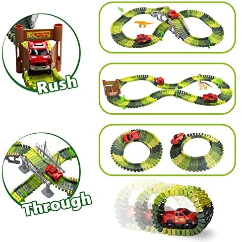 Flexible Dinosaur Race Tracks : Be easy to assemble or take down to store. The track pieces dynamic and can twist left or right, which when the entire track is pieced together,also can adjusted to form a length and width trackallows alot of flexibility, make a new track layout for different variations.
