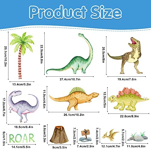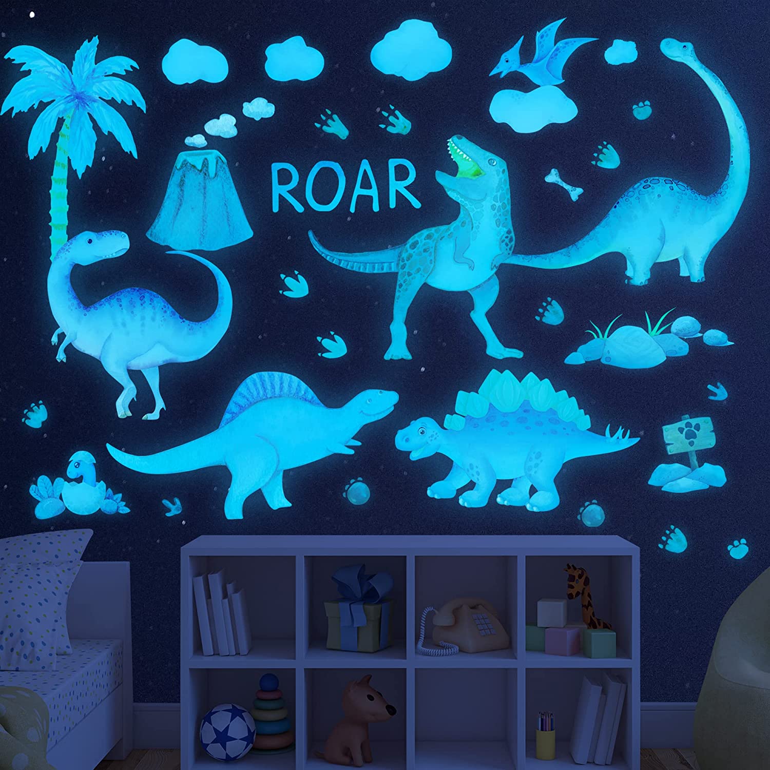 Package Include:The luminous dinosaur wall decals is designed with different types of watercolor dinosaurs,dino footprints,volcano,tree and more.The large dinosaurs are vibrant and spectacular colors in the daytime,also the dino decals will glow crazy and magically in the dark.Absolutely bring dinosaur lovers room to life. Glow in the Dark Dinosaurs:The glow dinosaur wall stickers are beautiful and glow like crazy,the brightness depends on the light it absorbs.These dinosaur wall sticker with foot decals are made of quality luminous material,they will glow brightly when absorb enough light during the day.We suggest you charge them with room light,sunlight or flashlight for 10-30 minutes.Note:(The light should shine unobstructed onto the stickers and ensure they absorb enough strong lights) Quality Glow Dinosaur Decals:The Large dinosaurs are made of high quality vinyl,glossy,fluorescent materials,nice and thick,non-toxic, eco-friendly, waterproof.These dinosaur stickers will cling any surfaces for years with the powerful adhesion design.Also they are extremely easy to remove and reposition,but never hurt your walls and leave no residues behind when you dont want it. Peel and Stick,Wide Application:Dinosaur boys room wall decor stickers are simple to apply and come off from the sheet easily.These dinosaur game decals are designed with powerful adhesion,can be widely applied to most of smooth, flat, dry and clean surfaces.These dinosaurs glow in the dark wall stickers can meet wide application for living room, playroom, nursery,bathroom, bedroom, classroom,bathroom,closet doors, glass windows, wallpaper etc. Satisfaction Guarantee:We are glad to give much fun to you,Kids will fall asleep peacefully looking at these gently glowing decoration.If the dinosaur sticker will not stick, have a defect, broken or damaged, feel free to contact us we will solve it and satisfied you immediately.