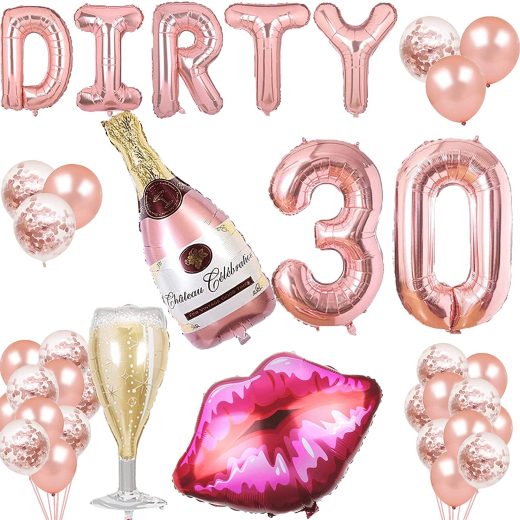 APPLICATION: Rose gold DIRTY 30 balloons are great to decorate for the hello 30 party, cheers to 30 years old party, 30 & fabulous party, funny 30 …