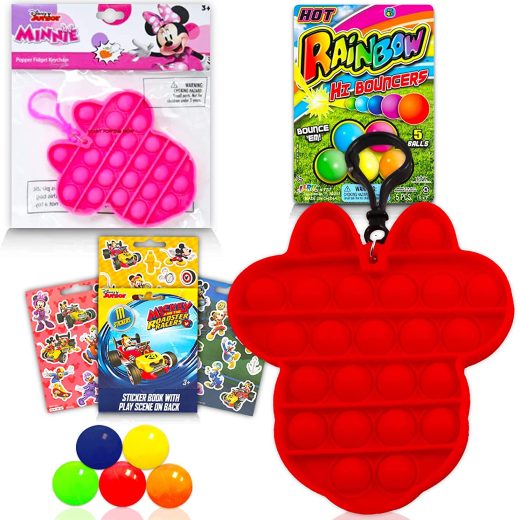Minnie Mouse Pop Fidget Toys Set – Bundle Including Minnie Fidget Keychain With 5 Rubber Bouncy Balls And Mickey And Minnie Roadster Stickers