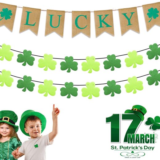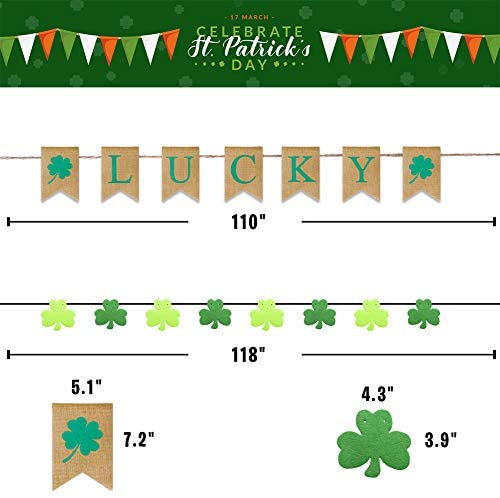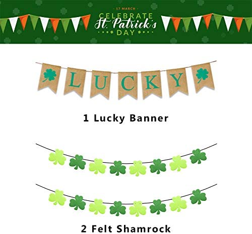 Felt,Burlap BEST ST. PATRICK’S DAY DECORATIONS- Includes 2 Felt Shamrock and 1 Lucky Banner,lower price,perfect combination,pirate green and apple green color,creates a pleasant and warm atmosphere at your St. Patricks Day. EASY TO INSTALL & READY TO HANG -The Felt Shamrock decor hole diameter is neat, easy to group.The Lucky banner comes pre-assembled and ready to hang,looks perfection if hang on the wall or fireplace, around or above the table, at the party reception. SIZE – Lucky banner String length: 2.8 M / 110 inch and each garland contains 8pcs shamrock signs, each one measure 10cm / 3.9” in diameter, 2.5m/ 8.2ft long of the rope. DURABLE AND GREEN COLOR DESIGN – The shamrock clover banners decor are made from thick, sturdy felt and the lucky banners are made from durable burlap,can be reused many times not just St Patricks Day, also you can use in rustic Irish wedding decoration. SATISFACTORY CUSTOMER SERVICE – If you have any unhappiness about this purchase, please do not hesitate to contact us,we promise solve for you within 24h.If you are looking for the one and the only home decoration for your St.Patricks Day celebration, this unique designed St.Patricks Decor is definitely your first choice!