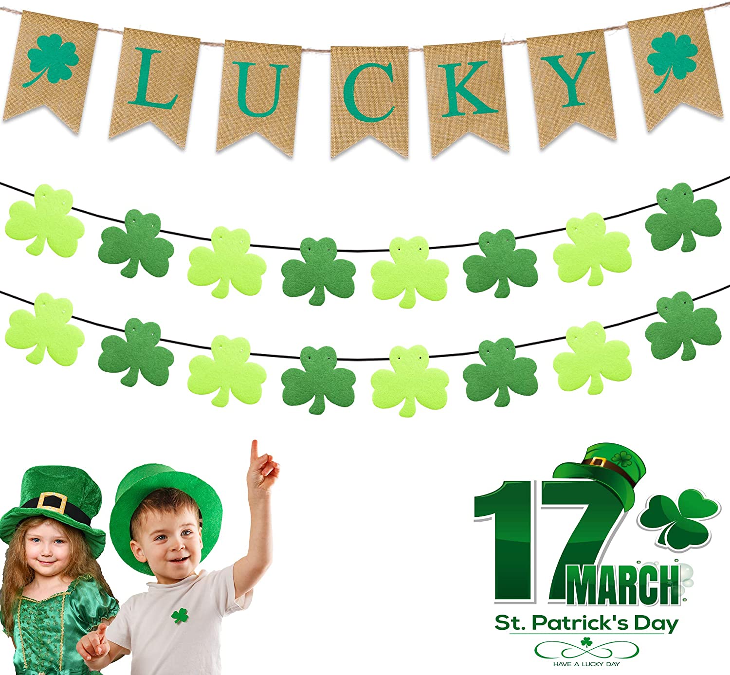 DMIGHT St.Patricks Day Decorations,2 Felt Shamrock Clover Garland+ 1 Lucky Burlap Banner,St. Patrick s Day Banner Decor perfect for Irish party supplies- Green and Light Green Color