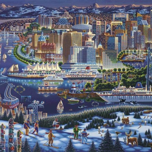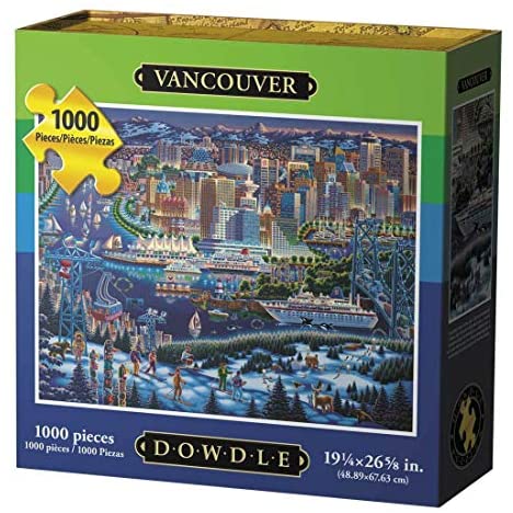 CREATE A LASTING PIECE OF ART representing Vancouver. ENJOY THE PROCESS OF BUILDING THIS 1000 PIECE PUZZLE measuring out to be 19 X 27 inches. COLLECTABLE PUZZLES FEATURING LOCATIONS from around the world. These collector painting help you feel part of the culture. From Islands to Mountains, from Sports to Holidays, collect them all today. MADE IN AMERICA (USA). Made of a Blue Chip Board that is imported from Holland. High quality puzzle cardboard. INCLUDES SPECIAL HIDDEN CULTURAL and city based references and jokes. Use your brain. Enhance your dexterity. Can you spot the people, jokes and messages hidden in the paintings