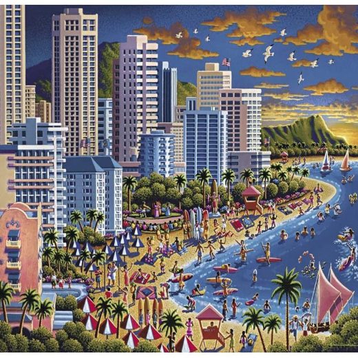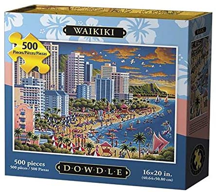 SLOW THINGS DOWN IN WAIKIKI – Ah, blue Hawaii! Slow things down and take in the enchanted coasts of this pacific island state on the shores of Waikiki. High rise hotels line the beach and the setting sun glows behind iconic Diamond Head TAKE A DIP INTO ERIC DOWDLES PUZZLES Beaches! Who wouldnt like it Take a dip into Eric Dowdles paintings of some of the worlds most fun, and favorite beaches. CREATE A LASTING PIECE WITH THIS PUZZLE – Enjoy the process of building this 500 piece puzzle measuring 16 by 20 inches; Create a lasting piece of art representing the enchanted coasts of Waikiki A GAME WITHIN A GAME – This puzzle piece includes special hidden cultural and city-based references and jokes. Use your brain, enhance your dexterity and spot the people, jokes and messages hidden in this piece of puzzle MADE IN AMERICA – Dowdle Folk Art puzzles are made of a Blue Chip Board that is imported from Holland; High quality puzzle cardboard