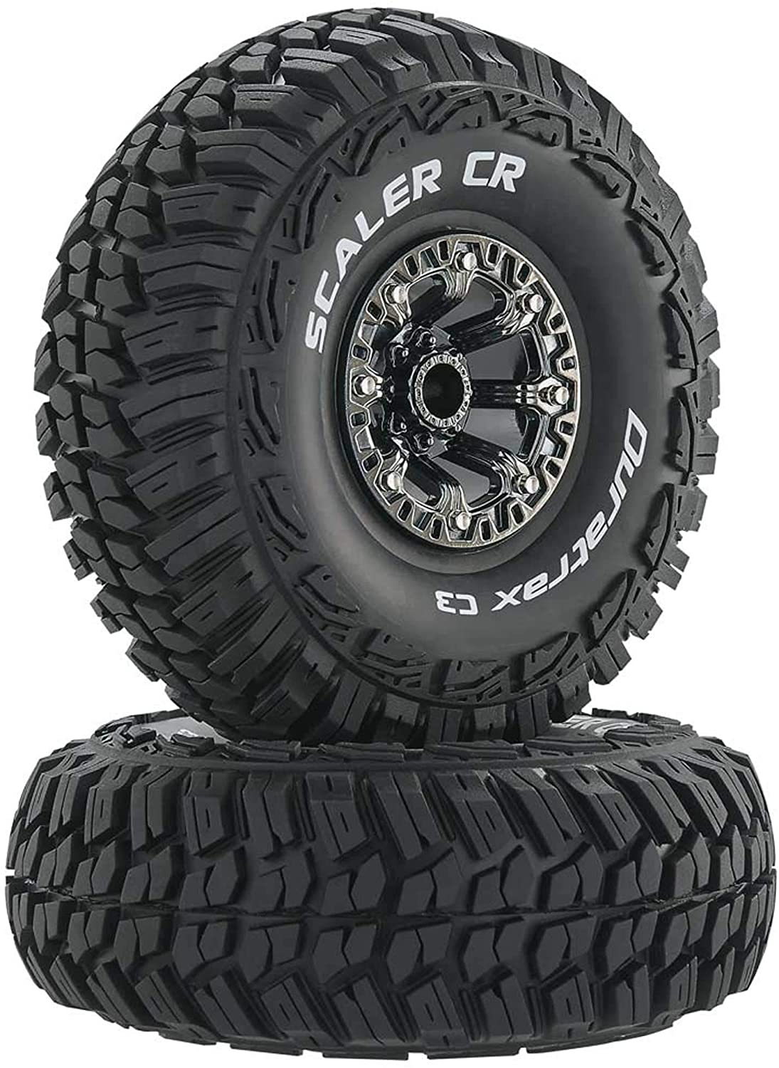 get a grip.duratrax performance crawler tires offer four tread patterns to give your scale RC rock crawler the customization you need. Choose Scaler or approach for a moderately aggressive tread or go big with deep woods and showdown treads for the aggressive traction You need to get to the top.features:scaler tires feature moderately aggressive tread for the off road traction your RC crawler demands.super soft C3 compound delivers maximum gripping power for loose conditions – dry and loamy, or wet and muddy.deep Lugs are tough enough to plow through all kinds of rough, off road terrain.maintains superior performance on pavement and grass as well.Includes grooved, ca-safe firm compound foam inserts that confirm to the tires reinforcing rib for added sidewall support and improved handling.pre-mounted on 2.2 8-Spoke wheels for convenience- no gluing or mounting necessary.includes:two Scaler tires with foam inserts, Pre-Mounted on 2.2 Black chrome wheelsspecifications:outer diameter: 5.5 inches (140 millimeters)width: 2.0 inches (51 millimeters)inner diameter: 2.2 inches (56 millimeters)hex size: 12mm (millimeters)