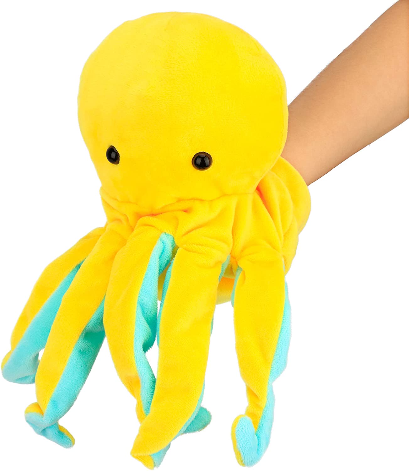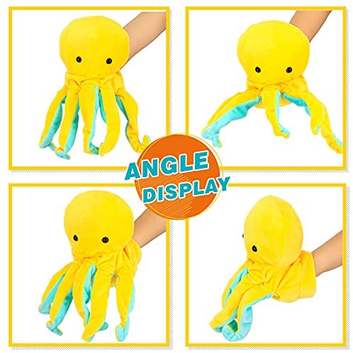 CUTE OCTOPUS IMAGE: This plush octopus hand puppet toy has a lovely and vivid image. It has five yellow and blue tentacles. Small round plastic eye…