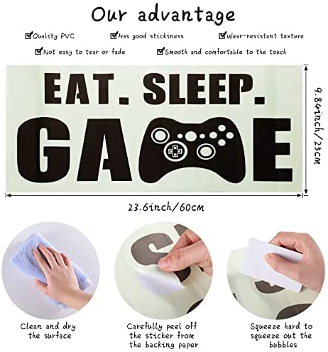 Eat Sleep Game Wall Decal Glow in The Dark Gamer Boy Wall Stickers Vinyl Video Game Wall Decor Gaming Controller Wall Decals for Boys Room Kids Bedroom Home Playroom Decoration