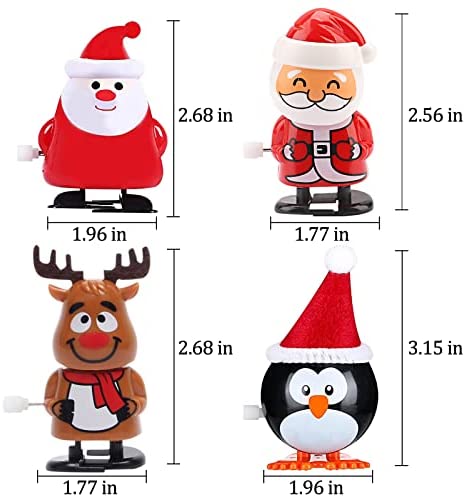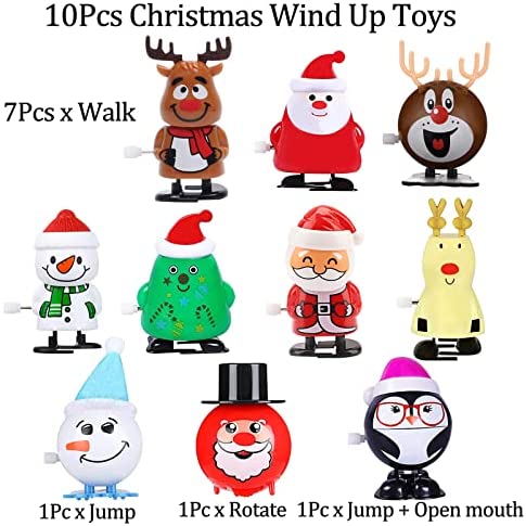 10 PCS Wind Up Toys Pack:This Christmas wind up toy set includes 10 different popular Christmas characters, such as Santa Claus, snowman, elk, penguin etc. The different styles mini toys are very cute, not a single one is the same, offer you and your children many choices. High-Quality Christmas Toys: Our Christmas wind up toys are made of upgraded plastic materials, sturdy and durable with good toughness, smooth with no sharp edges, keep away from hurting the hands. Best Christmas gift for your kids. Easy to Play: Christmas wind up toys can perform different actions such as walking, rotating and Jumping. Easy for little hands to grasp and play, just twist the clockwork and put them on the table or floor, they will perform various actions. Note: please dont twist too tightly, or the spring will damage easily. Christmas Stocking Stuffers: Christmas wind up jumping toys with bright colors will be sure to sparkle your Christmas party. They look spooky and have a unique style. Perfect for Christmas party favor, trick or treat handouts, Christmas stocking stuffers. Professional Satisfied Guarantee For Christmas Toys: We provide 100% satisfaction guarantee, if you are not entirely thrilled with your purchase for any reason, please contact us, we will provide you professional worry-free guarantee.