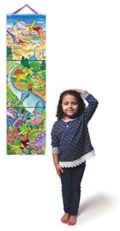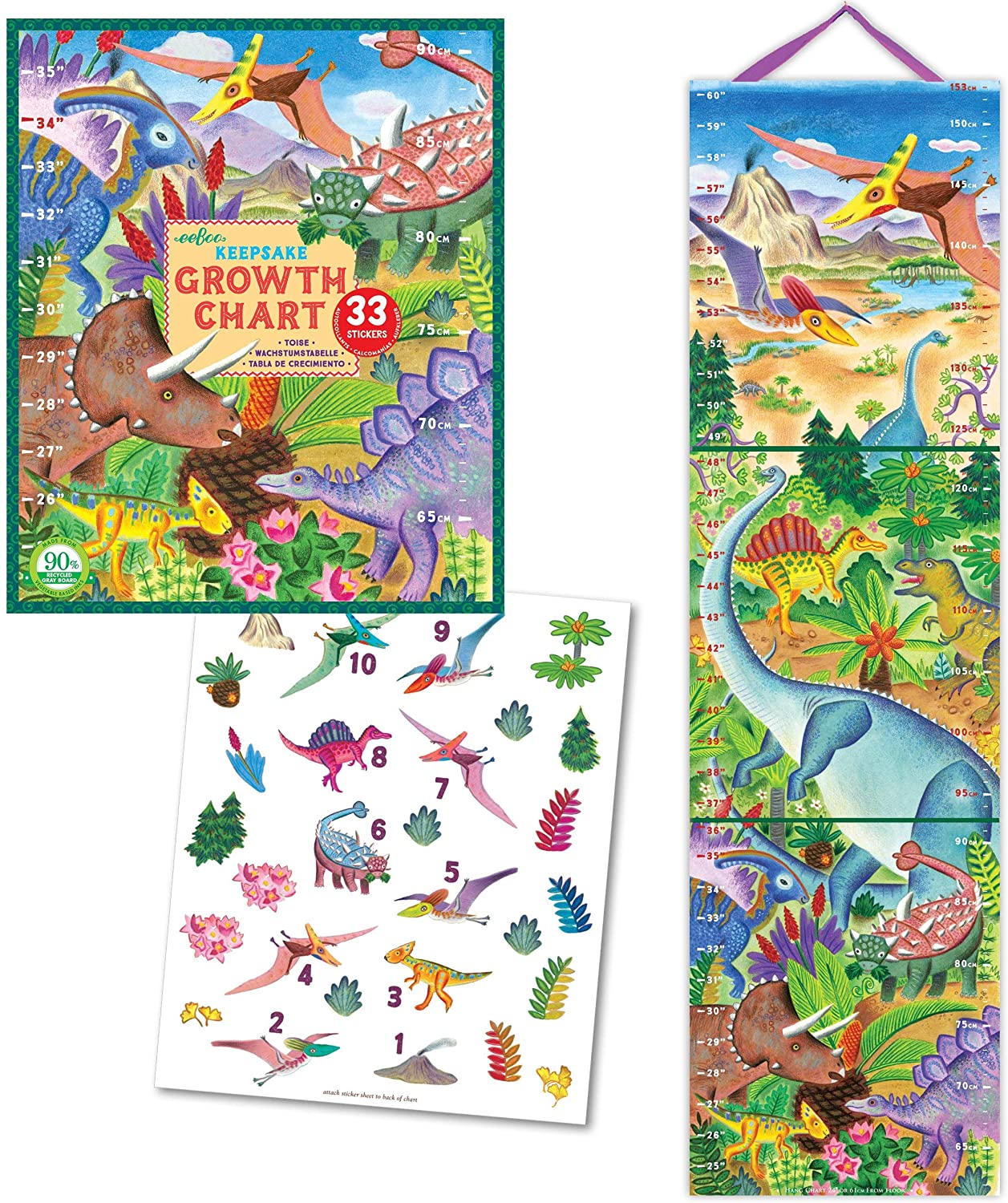 Measure up your height against eeBoos Grow Like a Dinosaur Growth Chart. eeBoos Grow Like a Dinosaur Growth Chart is a scene from another time, full of all your favorite dinosaurs from the Pterodactyl to the famous T. Rex. Perfect decor for a dinosaur themed room! Measure your height with this colorful growth chart. This dino-themed growth chart is 36 inches long when unfolded and 10 inches wide. Easily hung with an attached gross grain ribbon. Illustrated by Holly Berry.