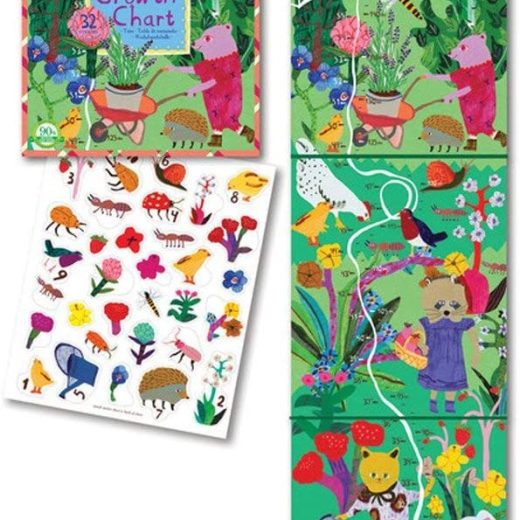 Measure up your height against eeBoos Making the Garden Growth Chart. This garden-inspired growth chart is 36 inches long when unfolded and 10 inches wide. Easily hung with an attached gross grain ribbon. Illustrated by Monika Forsberg.