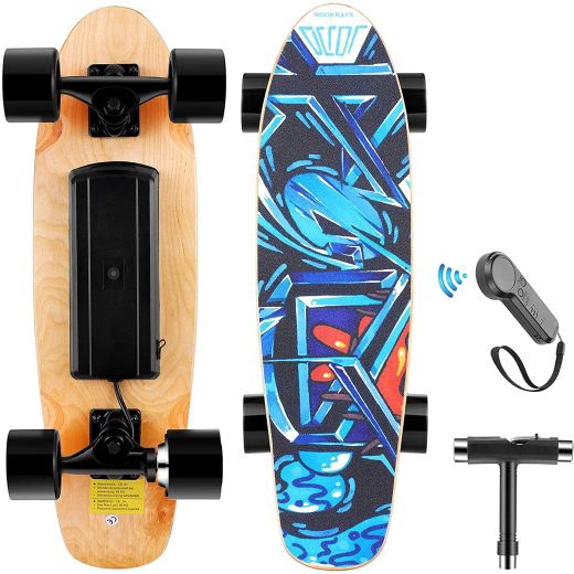 ERGONOMIC WIRELESS REMOTE – The skateboard comes with a 2.4Ghz wireless remote control that controls forward, backward, accelerate and brake. Its control distance can reach 14m. With led indicators, keep you informed the skateboard battery level