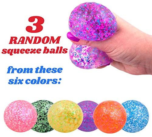 Package includes 3 squishy balls. Squishy ball colors are chosen random out of 6 available: yellow, purple, green, pink, orange and blue. Size of each squishy stress ball is 2.75 inches / 7 cm.Stress relief toys help a lot to cope with anxiety in difficult situations. And these squish balls are no exception – give an anti stress ball to those in need and watch how it quickly reduce their anxiety. Squishy stress ball has a soothing effect when squeezed. Calming is doubled by the fact that squeeze balls for stress relief help with muscle tension. If ever feeling nervous, take a single stress ball and squeeze it for as long as needed.Give away these squishy stress relief balls as gifts to coworkers – stress squishies will help them during hard times, help relax and even entertain a little bit. Kids stress balls squishy notion always bring children a enjoyable experience and they love it. Kids squishy ball is a welcome gift at party favors as well. Colorful squishy ball for kids will occupy their mind for a long time.Gel stress balls for kids has beads inside. Bead stress ball is useful not only to reduce anxiety, but also for hand grip development. Moreover, squishey stress ball can help with hand rehabilitation. Squeeze stress ball tremendously help avid gamers to relieve emotions and stress. In addition, super squishy stress ball let hand muscles stay healthier.Squishies and stress balls can be used as a fidget squishy ball too. Both children and adults need something to get their hands busy from time to time – these squishy ball toys serve this function very well.Please, dont use sharp or pointed tools such as knives, pens and pencils, fingernails and so on to stab the stress squishy ball.Please, tell children not to put squishy stress ball toys in their mouth.Outer shell of the kids stress ball is consumable – it can withstand only a limited amount of squeezing.