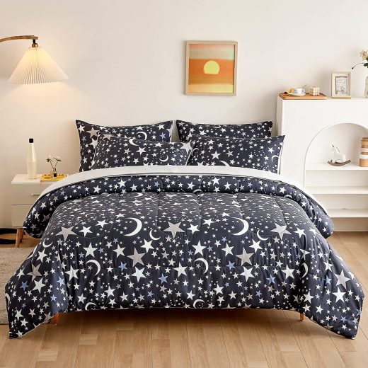 Ultra Soft Fabric:This kids comforter set made of premium quality microfiber material.300GSM Whole-piece microfiber filling.Comfortable, breathable,skin-friendly, lightweight and soft texture to use. Design:This comforter set is dazzles with white gray and blue stars and moon scattered across the charcoal ground, for an out of this world look. Good Choice as a Birthday Gift or Christmas gift to Kids, Super soft and great for all seasons Package Included:5 pieces queen size bed in a bag includes: 1 comforter(90*90),2 pillowcases(20*30),1 fitted sheet(39*75+14),1 flat sheet(66*96) Easy Care:The bedding sets is easy care.The comforter will not shrink and fade after washing.Machine washable in cold water, gentle cycle, tumble dry at low heat. Satisfactory Service:As your satisfaction is of the most importance to us If you have any query or issue about the cute bedding , please feel free to contact us, we are always here at your service
