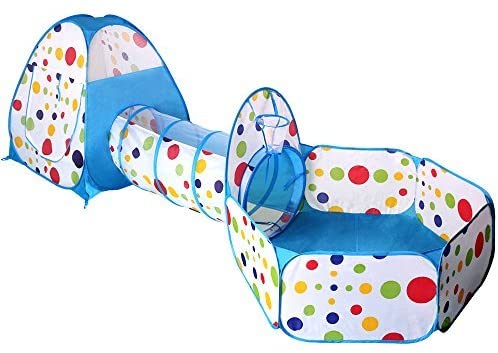 Roomy:Consist of tent house, tunnel and ball pit pool. The 3pc playhouse for kids create a fun filled playground for child to crawl and play, improve baby’s independent ability. (BALLS NOT INCLUDED). Safety:Soft fabric with non-toxic and odorless colorful polka dot printed allows for a safe & environmental friendly playhouse for the kids. Breathable mesh design visualize the view inside for watching out, Mosquito-proof. Durable & Portable:Flexible and firm steel holder with safe hose. Doubly-sewed and washable polyester fabric is highly resistant to wear and tear. Quick & Easy to set up, fold and store. Lightweight with a zipper storage case. Multifunctional:Best toddler toys for birthday parties, parks, picnics, backyard BBQs, playgrounds, day care, school, carnivals, sleepovers, indoor or outdoor play! Great for pets as well. The tunnel, tent & ball pit can be used together or separately. Size:117(L) X 47(W) X 39(H) (unfold size); folded package size: 20(D).