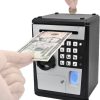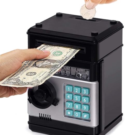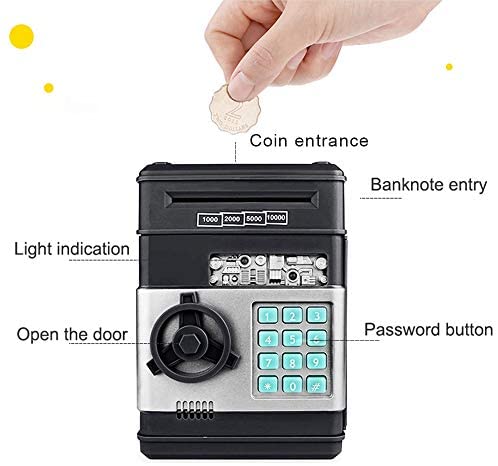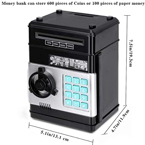 High & Safe material Made of 100% safe ABS plastic and electronic components.The body is made of environmentally friendly anti-fall material, which is strong and anti-fall, greatly extending the service life.You can rest assured to give it to the kids,children,boys and girls. In addition,on important holidays such as Christmas, Thanksgiving, birthday, Mothers Day, Fathers Day,and the school season, your kids can use their savings to buy gifts for themselves, friends, and parents. Digital Password ProtectionThe piggy bank has a password-protected lock.The default password is 0000 and you can set it to other 4 digit password. If you forget your password, please remove the batteries and re-install.The password will be restored to default password 0000.Batteries: 3 x AA batteries(not included). Kids Treasure Keeper Safes & BankThere are two saving ways: When you put the paper money on the scroll, it can be rolled into the kids atm bank machine automatically. There is a coin slot on the top to put coins to save money.It can store 600 coins or 100 banknotes, greatly help improve children ’s financial awareness, and let your child develop the best habit of saving money. Multi-function Money BankThis MONEY SAFE guards your personal stuff. Can be used to place coins, banknotes, jewelry and other personal items that are a cool fun stuff gift for teen girls and boys. The coins slot at the top lets you use the safe as a piggy bank. Delicate Gift for KidsCpsia Warning : Choking Hazard Small Parts,This piggy bank can provide exquisite gifts for children,you can use it as a birthday gift,Thanksgiving gift,party gift,Easter gift and so on.Its fun for kids to have the pocket money grows as they save their money for toys, candy and gifts. Your kids will learn the value of a dollar as they discover how rewarding it is to save.Use it to help them develop a good habit of saving money.