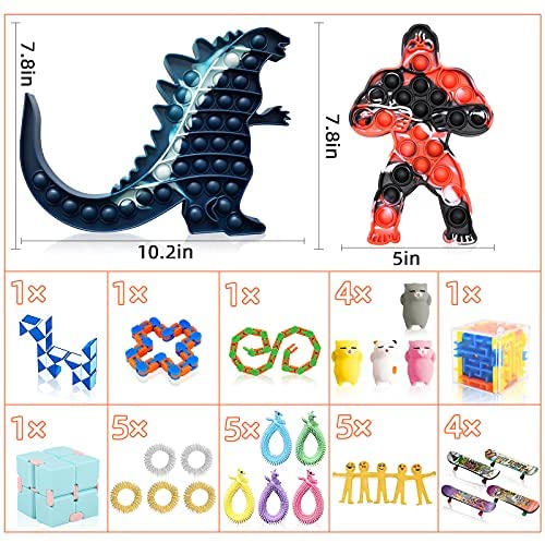 Stay Away from Your Phone!Let’S Play Fidget Toys to relief Stress with Children. Everyone’s life experience is different, and the mentality of playing this toy is different. The fidget toy set can help you find fun when you are bored, relief your stress when you are stressed, or give it as a gift to your friends or lover. Great Gift for Adult and Children. Fidget sensory toys help to relief stress, calm nerves and increase focus for children and adults, especially those with ADHD, ADD, OCD and autism. Versatile Uses Ideal for parties, holidays, classrooms or for use as office toys. The toys keep you alert and focused throughout the day and help to develop new ideas. Great for students who can’t sit still. Package includes: 1 * Big Push Pop 1 * Variable Magic Ruler 1 * Maze Cube 1 * Infinity Cube2 * Bike Chain Fidget 4 * Finger Skateboard 4 * Silicone Cat Pinch 5 * Unicorn Stretchy String 5 * Smiley Men Stretchy Toys 5 * Anti-stress Fingers Rings Warm Tips: 1. CHOKING HAZARD. Recommended age: Over 3 years old. 2. Children should be used under adult supervision.