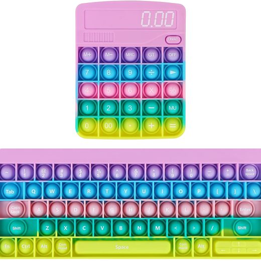 Evermarket Big Rainbow Keyboard Calculator Push Pop Bubble Sensory Toys,Jumbo Size Simple Fidget Toys.Everyone Needs Stress Reliever. Features: Ever catch your friend, or maybe even yourself, popping the bubble wrap right of the box of a package Then youll love this bubble fidget toy. Relieve stress: Just press the bubbles down and they make a slight popping sound; then flip it over and start again! Endlessly reusable and washable, too. Material:Silicone How to play: 1 Players take turns pressing down any number of bubbles they wish in a single row. 2 The player who presses down the last bubble loses the round. 3 Whoever wins two of three rounds wins the game! Its as simple as that! Novelty gifts for boys girls parent friends and autism. Package include: 2 Pack Multicolored Keyboard Calculator Push Pop Bubble Sensory Fidget Toy