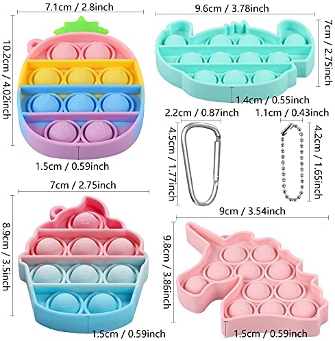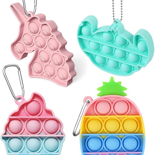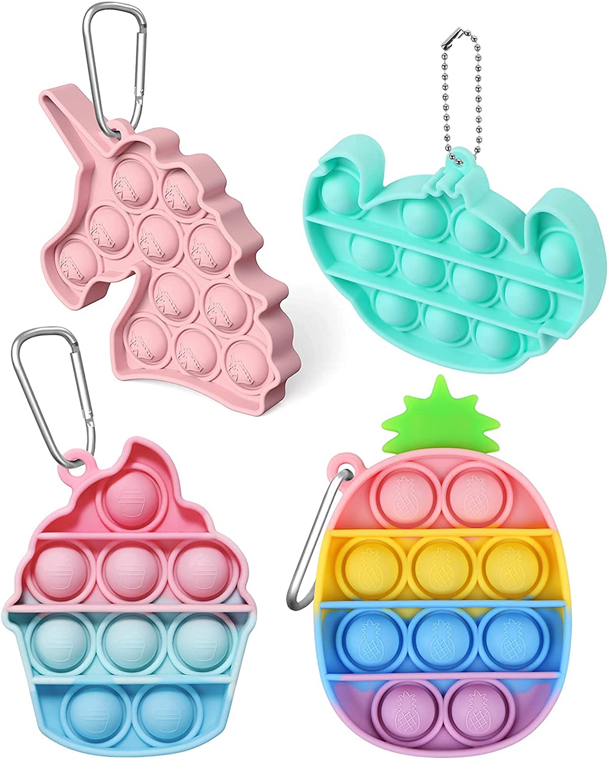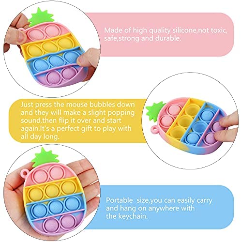 4 Pack Mini Simple Fidget Toy,Push Pop Bubble Fidget Sensory Toy Keychianw.Everyone Needs Stress Reliever. Features: Ever catch your friend, or maybe even yourself, popping the bubble wrap right of the box of a package Then youll love this bubble fidget toy. Relieve stress: Just press the bubbles down and they make a slight popping sound; then flip it over and start again! Endlessly reusable and washable, too. Material:Silicone How to play: 1 Players take turns pressing down any number of bubbles they wish in a single row. 2 The player who presses down the last bubble loses the round. 3 Whoever wins two of three rounds wins the game! Its as simple as that! Novelty gifts for boys girls parent friends and autism. Package include: Push Pop Bubble Sensory Fidget Toy Keychain x4 in Yellow Pineapple,Rainbow Pineapple,Blue Stitch,Rainbow Ice Cream designs.