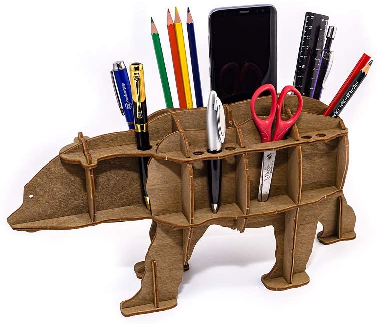 EWA Eco Wood Art AV0523119 Bear Organizer, Pencil Holder, Desk organizer decoration, 3D Assembly Wooden Puzzle,14.8-inch Length, Brown, 14.8Lx4.1Wx7.7H