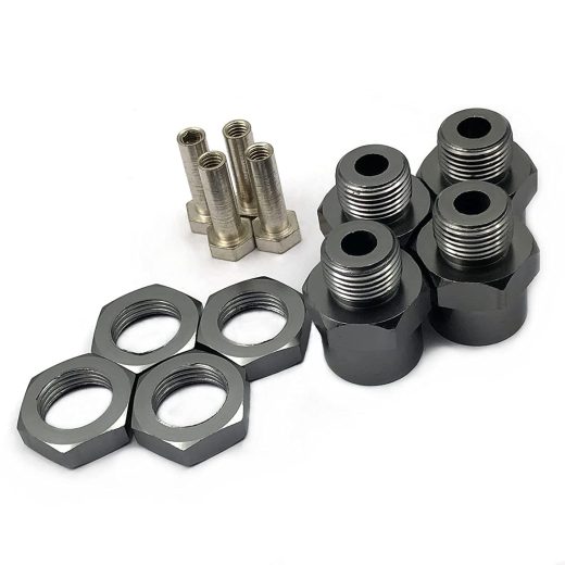 This is the Aluminum 12mm to 17mm Wheel Hex Hub Conversion Adapter for 1/10 RC Car Upgrade Parts FEATURES Great if looking to put 1/8 scale 17mm hex wheels on your model Adapters and wheel nuts are anodized Titanium in color NOTE: These are not suitable for 2WD models using bearings instead of 12mm hex hubs. Specification Color: Titanium Material: Aluminum Alloy Model: N10178 Total length: 24mm Max axle diameter: 5mm Axle thread: M4 Screw cap diameter: 12mm/0.47(OD) Weight: 48g PACKAGE INCLUDE: 4x wheel adapters 4x 5mm bolt 4x Screw cap