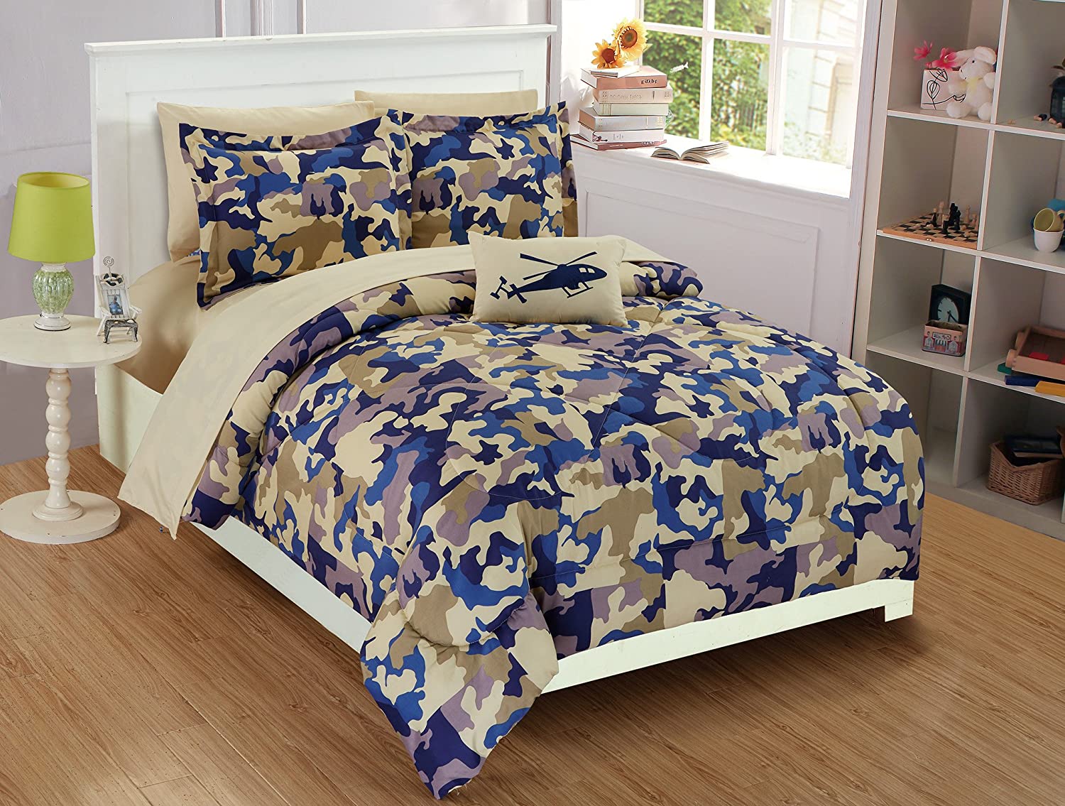 Fancy Linen Kids/Teens Comforter Set Army Camouflage Beige Taupe Blue Comforter Set New # Camouflage (Full)
