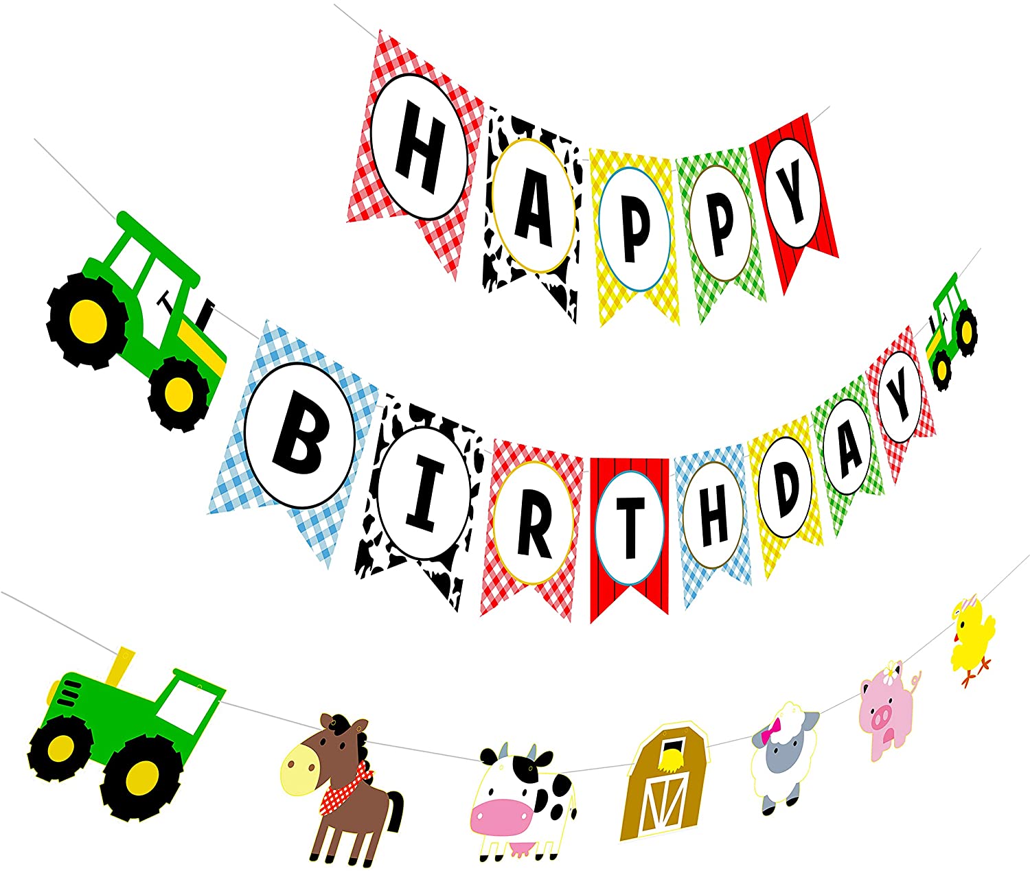 Farm Birthday Banner, Tractor Happy Birthday Sign with Animal Garland, Rustic Bday Party Decorations