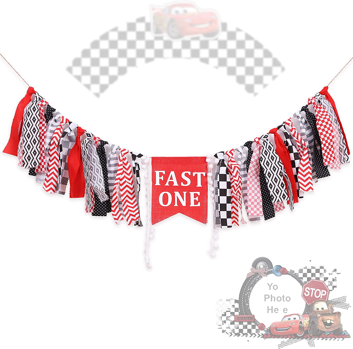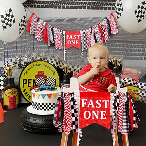 Fast One Birthday Banner – Black and Red Race Car Theme Highchair Banner for Childu2019s 1st Birthday Party (Fast ONE)