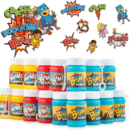 FAVONIR Superhero Bubbles & Tattoos Party Favor Set u2013 24 x Kids Bubble Bottles 72 Temporary Tattoo Stickers for Kids u2013 Hero Themed Party Favors for Birthday, Classroom Parties & Holiday Goodie Bag fillers.